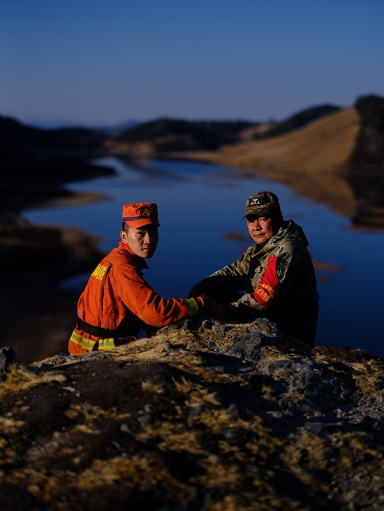3月12日,四川省凉山彝族自治州木里藏族自治县白碉苗族乡呷咪坪村,森林消防员伍正忠(右)在轮休时与父亲一起守山林。从2020年开始,伍正忠的父亲、哥哥以及大部分亲友都加入了当地的半专业扑火队伍。每年的森林防火期,他们都会24小时在检查站轮守、巡护、瞭望。