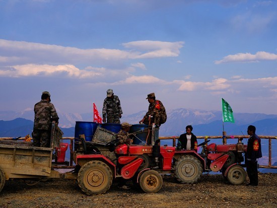 3月15日,木里县项脚蒙古族乡林区,项脚乡的民兵们正在给参与修建防火通道的拖拉机补充油料。这里海拔约3200米,远处可以看到雪山的轮廓。