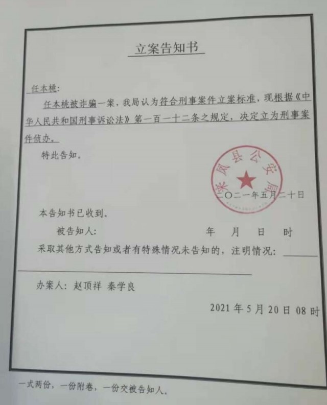 中国青年报客户端福州4月2日电(中青报·中青网记者 陈强)今天下午,湖北省来凤县女青年任本桃终于收到当地警方的“立案告知书”,而立案告知书日期是“2021年5月20日”。任本桃称, 2021年5月12日,她向来凤县公安局翔凤派出所报案,自己被自称是人民日报《民生周刊》记者的福建男子卢绍龙骗走4万多元,但案件受理后一直没有下文。今年4月1日,她在微博上披露了自己的遭遇。