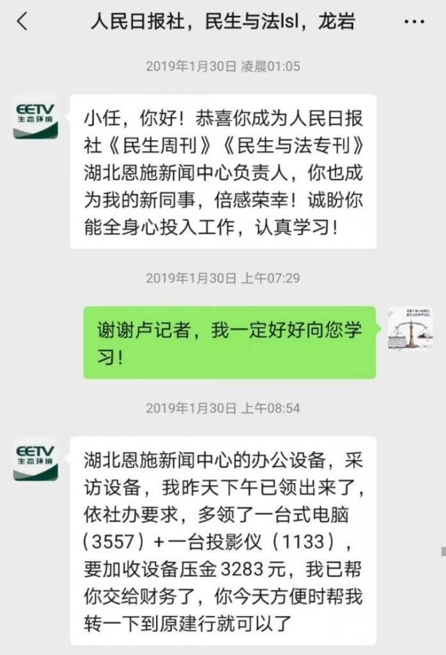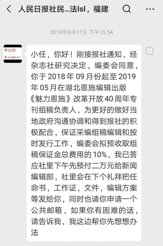 2018年8月1日,回到湖北老家的任本桃给卢绍龙发去个人简历,随后按卢的要求给他微信转账1080元,作为“工作证的制作费及工作押金”。8月16日,卢给任发微信说,“刚接报社通知,经杂志社研究决定,编委会同意,你于2018年9月起至2019年5月(作为)在湖北恩施编辑出版《魅力恩施》改革开放40周年专刊组稿负责人。为更好的(地)做好当地政府沟通协调和得到报社的积极配合,保证采编组稿编辑和按时(完成)发行工作,编委会拟预收取组稿保证金总费用的10%。我已答应社里下午先预付2万元给新闻编辑部,社里会在下个礼拜把任命书、工作证、文件、编辑方案等发给你。”当天,任给卢指定的银行个人账户汇款2万元。
