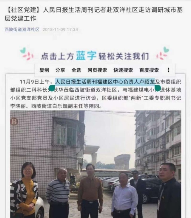 中青报·中青网记者注意到,2018年11月9日龙岩市新罗区西陂街道双洋社区居民委员会的微信公众号曾发表题为《人民日报生活周刊记者赴双洋社区走访调研城市基层党建工作》的消息,“11月9日上午,人民日报生活周刊福建区中心负责人卢绍龙及市委组织部二科科长刘秋华莅临西陂街道双洋社区,与福建煤电小洋退休基地小区党支部党员及小区居民进行访谈。”记者向同行的组织部干部刘秋华打听卢绍龙的情况,刘说他是经朋友推荐认识卢的,当时想请卢帮忙宣传基层党建工作,后来卢在中国网发了稿。