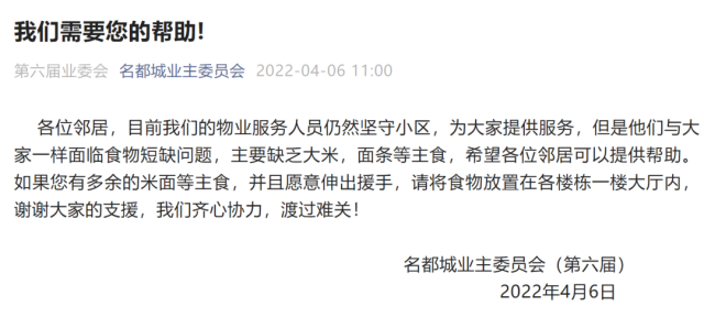 各位邻居,目前我们的物业服务人员仍然坚守小区,为大家提供服务,但是他们与大家一样面临食物短缺问题,主要缺乏大米,面条等主食,希望各位邻居可以提供帮助。如果您有多余的米面等主食,并且愿意伸出援手,请将食物放置在各楼栋一楼大厅内,谢谢大家的支援,我们齐心协力,渡过难关!