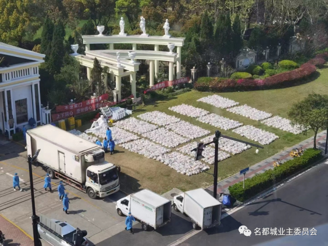 据公众号“名都城业主委员会”介绍,封控期间,该小区1541户居民“足不出户”,为了确保核酸抗原检测盒分发和保供菜卸货发放的顺利,居委会干部、物业工作者和广大志愿者们都在付出努力。