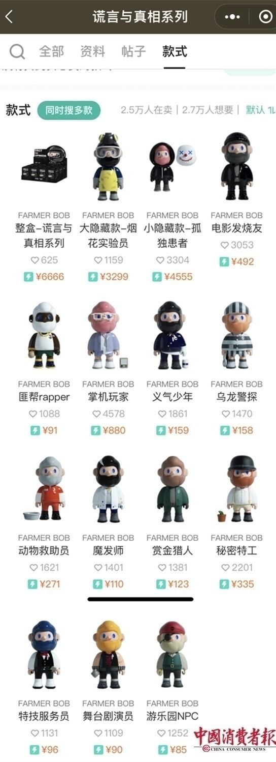 ▲张先生在盲盒星球下单的“BOB谎言与真相”系列在潮玩族的售价截图。