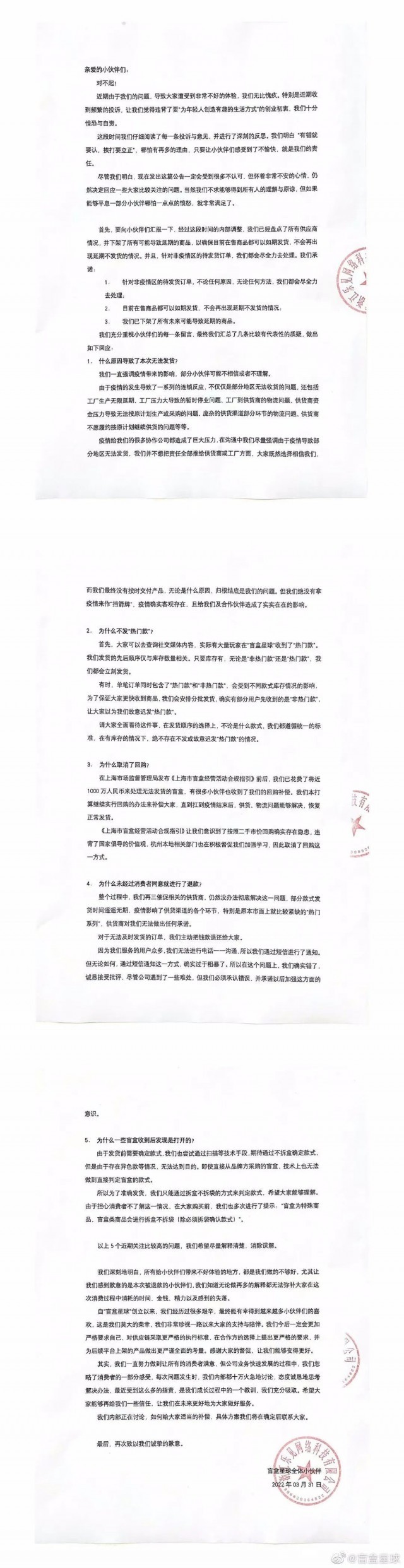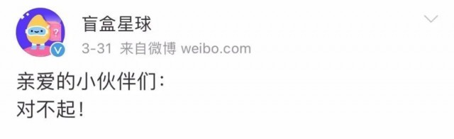 3月31日,盲盒星球官方微信公众号发布《致歉信》,表示:“盲盒星球下架了所有可能导致延期的商品,以确保目前在售商品都可以如期发货,不会再出现延期不发货的情况。”