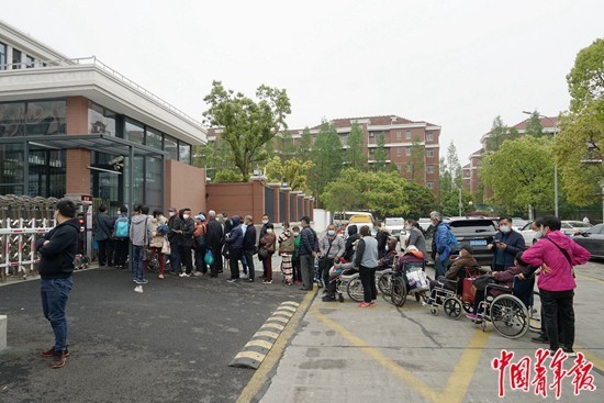 4月13日,上海市浦东新区,在临时改造的浦东医院曹路临时血透中心大门前,血透病人排队等待入院。