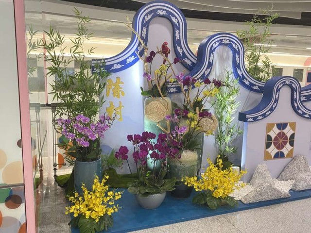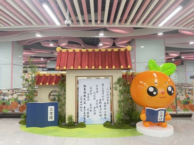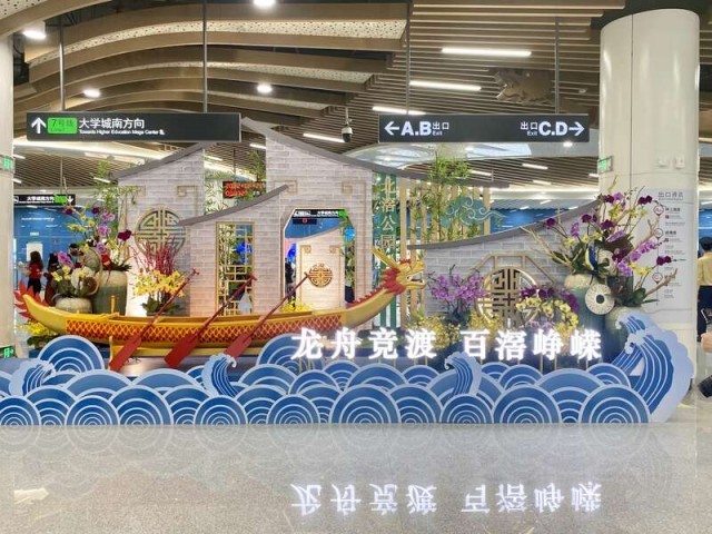 作为连接广州和顺德两地交流的纽带,广州地铁七号线西延段在车站设计上融入了地域文化。地铁出入口飞顶采用红色玻璃盒子和剪纸的风格,整体外形设计是龙舟的原型简化提炼,中间红色镂空铝板,既是龙舟的主要船体,也象征一条飘舞的香云纱色带。