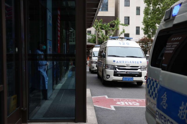 4月28日,上海市虹口区,救护车将病人送至上海市第一人民医院急诊室前等待入院。中青报·中青网记者 李强/摄