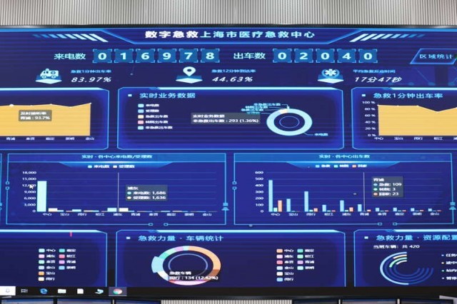 4月28日,上海市徐汇区,上海市医疗急救中心调度中心大厅的大屏幕显示,截至当日15时07分,有16978人次来电,但出车数量只有2040车次,急救12分钟到达率只有44.63%。中青报·中青网记者 李强/摄
