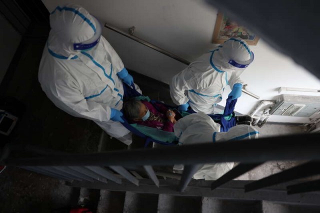 4月28日,上海市虹口区,救护车工作人员用软担架将一名病人抬下楼。中青报·中青网记者 李强/摄