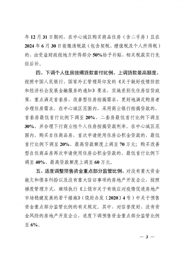 对房企来说,《通知》提到,适度调整预售资金重点部分监管比例。对没有重大资金拖欠和债务纠纷以及没有重大信访事项的房地产开发企业,按照梯度管理方式,继续执行《上饶市关于有效应对疫情促进房地产市场稳健发展的若干措施》(饶府办发[2020]4号)中关于预售资金重点部分监管比例的有关规定。其中,对信誉度好、没有资金风险的房地产开发企业,适度下调预售资金重点部分监管比例至6%。