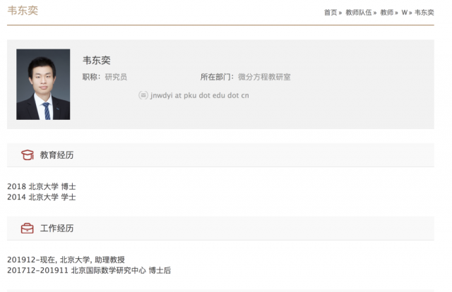 北大数学科学学院官网显示,如今的韦东奕在北京大学担任助理教授。