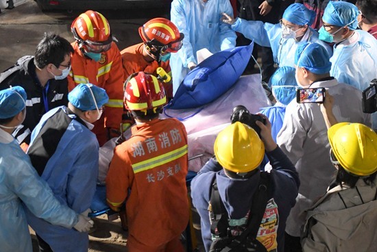 在这位医生离开后的十几个小时里,消防员用撬棍、千斤顶挪开了压住8号右腿的预制板,又用充气垫分离了勾住她左腿的杂物。5月2日晚上7点多,8号幸存者离开了废墟,被送往湘雅三医院。