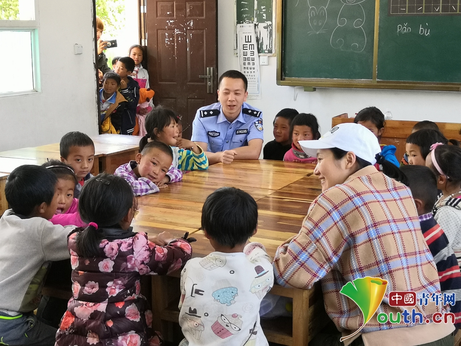 王玉鑫了解困难儿童学习情况。云南德宏边境管理支队供图