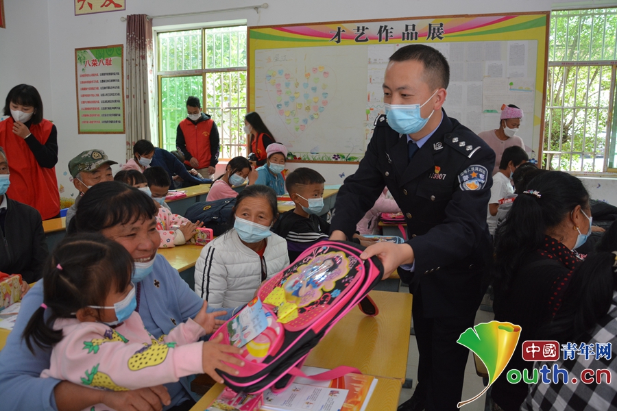 王玉鑫向困难儿童发放募捐物资。云南德宏边境管理支队供图