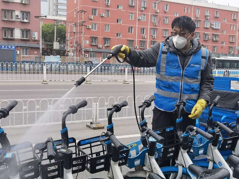 2020年至今,多家共享单车企业共同采取“无差别消毒”的行动。“不分品牌,不分颜色,我们对负责区域内的所有品牌共享单车进行一日三次的定时消毒。”卢洪伟说。在每次对车辆调度、摆放的同时,她都会对车辆进行消毒,消毒频次较以往提升2倍,达到6次以上。
