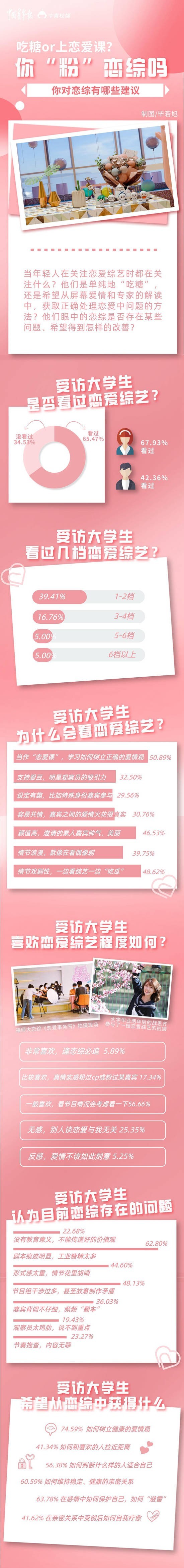 恋爱综艺是近年来进入人们视野的综艺节目形态,在电视台、网络平台不断推出各种恋综的同时,这类形式也开始向校园渗透,一些大学生也开始创制校园恋综。恋爱综艺受到关注的同时,关于一些节目形式感太重、剧本痕迹明显、因嘉宾背调不仔细而翻车的批评声也频繁出现。为了探究大学生对恋爱综艺的关注与期待,中国青年报·中青校媒面向全国3234名大学生展开问卷调查,结果显示,79.89%受访大学生表示喜欢看恋综,5.89%非常喜欢,逢恋综必追;17.34%比较喜欢,曾真情实感地喜欢某对情侣或喜欢过某个嘉宾;56.66%一般喜欢,视节目情况考虑是否观看;25.35%对恋综无感;5.25%反感此类节目,认为爱情不该如此刻意。