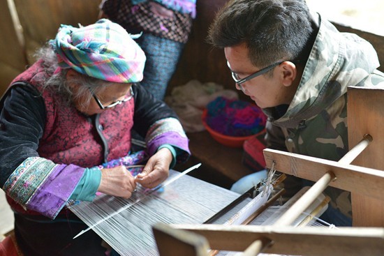 韦旭阳(右)向苗族奶奶学习刺绣技术。受访者供图