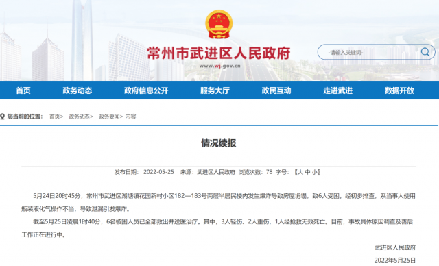 据江苏省常州市武进区人民政府网站消息,5月24日20时45分,常州市武进区湖塘镇花园新村小区182—183号两层半居民楼内发生爆炸导致房屋坍塌,致6人受困。