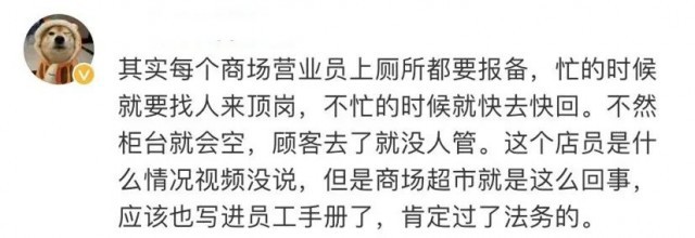 该工作人员自称其本人系与山姆会员店签订的劳动合同,没有被要求每天上厕所次数,“哪有上厕所还有规定的,人有三急呀”。不过该工作人员认为,上厕所先报备的要求是合理的,因为每个岗位要有人对接。