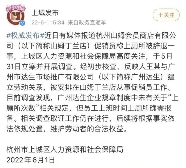 上班时上厕所次数还有限制?近日,有媒体报道,浙江杭州一山姆会员店促销员因上厕所被开除。该名促销员称,公司要求上班时间只能上2次厕所,必须在群里报备。6月1日,上城区人社局调查发现,公司没有“上厕所次数”相关规定,但上厕所确需报备。相关调查取证仍在进行。