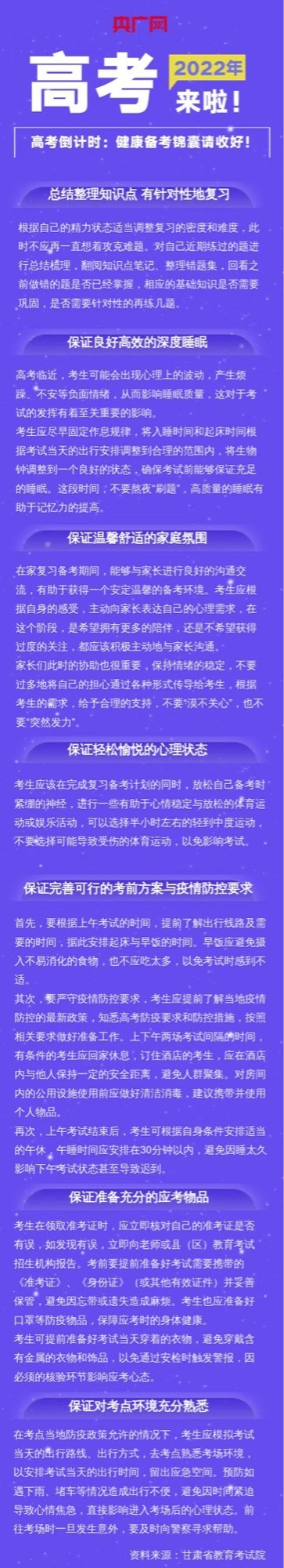 央广网兰州6月2日消息 (记者 邸文炯) 2022年高考已进入倒计时,收藏这份备考锦囊,科学高效地完善并修正自己的心理生理状态与复习计划,以最佳的状态迎战高考。
