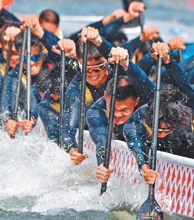 6月2日,参赛选手在海峡两岸赛龙舟活动中奋力划桨。新华社记者 魏培全摄