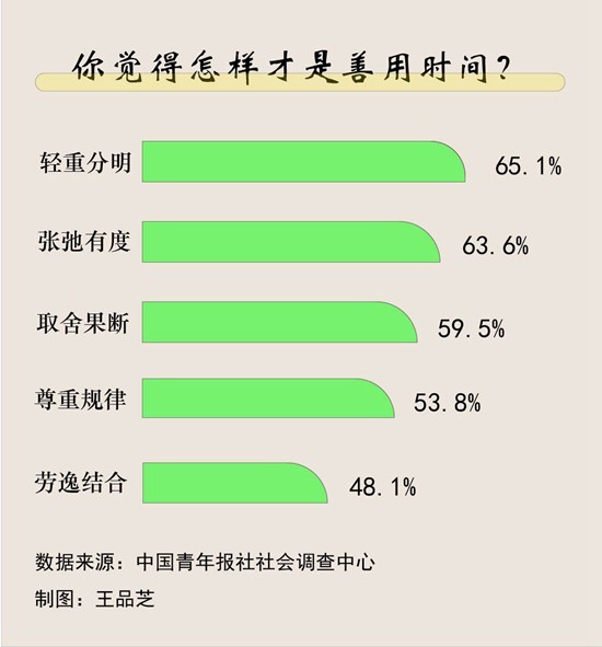怎样才是善用时间?调查中,受访青年认为应该做到轻重分明(65.1%)、张弛有度(63.6%)、取舍果断(59.5%)。其他还有:尊重规律(53.8%)、劳逸结合(48.1%)等。