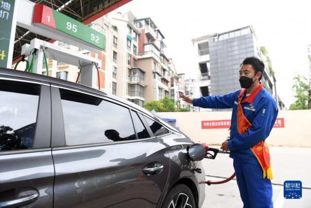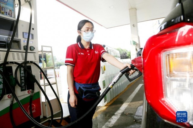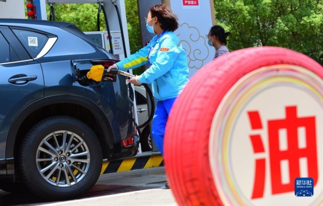 6月14日,江苏省无锡市一加油站工作人员给汽车加油。新华社发(还月亮 摄)