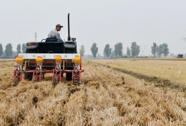 ↑6月16日,在河北省石家庄市栾城区城郎村农田里,张红磊开着播种机播种玉米。新华社发(李明发摄)