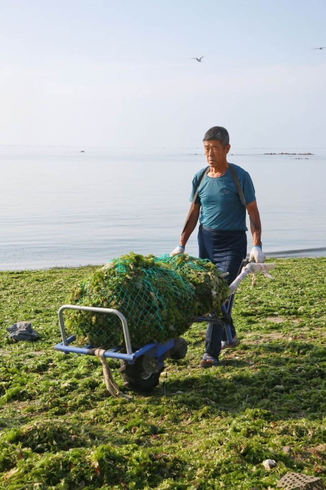 ↑6月16日,山东省荣成市龙家村村民龙增福推着电动小推车搬运裙带菜。龙增福在一家农业合作社打工,清晨会到海滩捡裙带菜。三年前他花费1600多元购买了电动小推车,提高了工作效率。新华社发(郭志华摄)