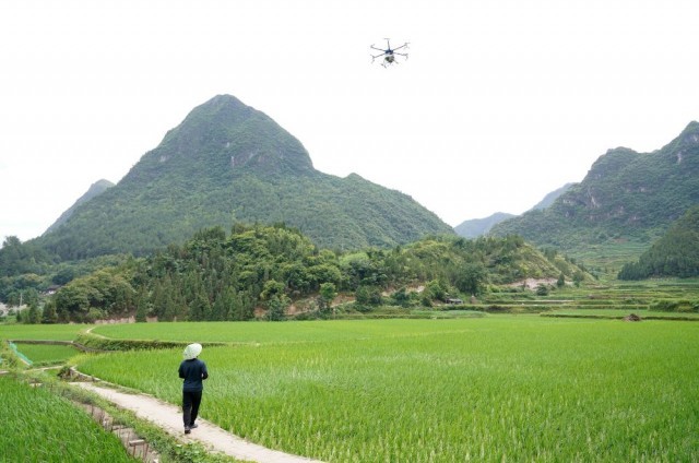 ↑6月15日,在贵州省黔东南苗族侗族自治州丹寨县龙泉镇交圭村,无人机操控员康龙用植保无人机为稻田进行病虫害防治作业。新华社发(黄晓海摄)