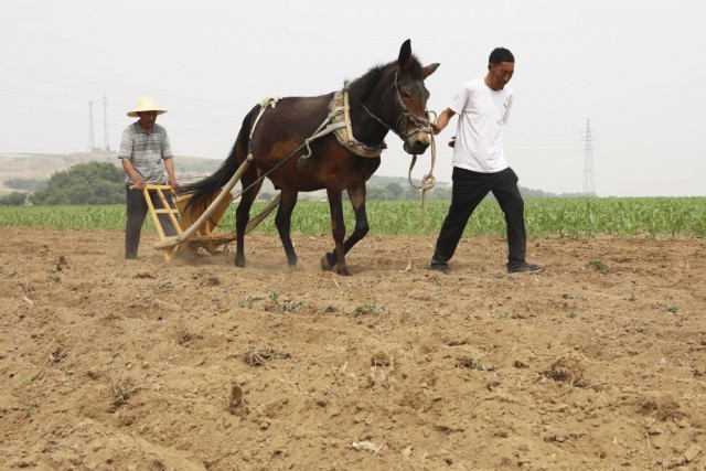↑6月17日,河北省蔚县南杨庄乡九宫口村82岁老人徐讲(左)和儿子徐树林在农田里牵着骡子用耧车播种。新华社发(武殿森摄)