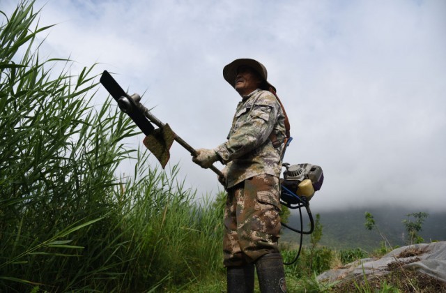 ↑6月16日,在云南省丽江市玉龙纳西族自治县黄山镇长水社区的农田里,村民木学礼准备用割草机割草。新华社发(赵庆祖摄)