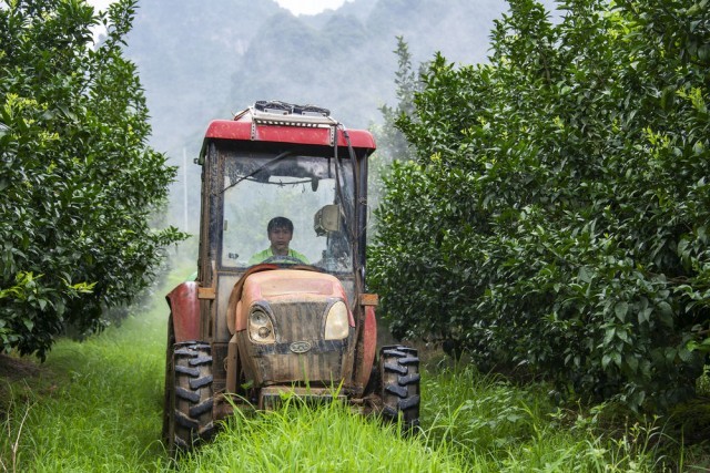 ↑6月17日,在广西靖西市化峒镇五权村沃柑种植基地,农机手李康驾驶连着喷药机的拖拉机喷洒农药。新华社发(赵京武摄)