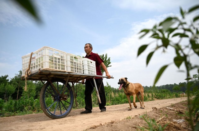 ↑6月16日,在河北省邯郸市丛台区招贤村,张静修搬运刚采收的西瓜,爱犬“图图”在旁陪伴。新华社发(郝群英摄)
