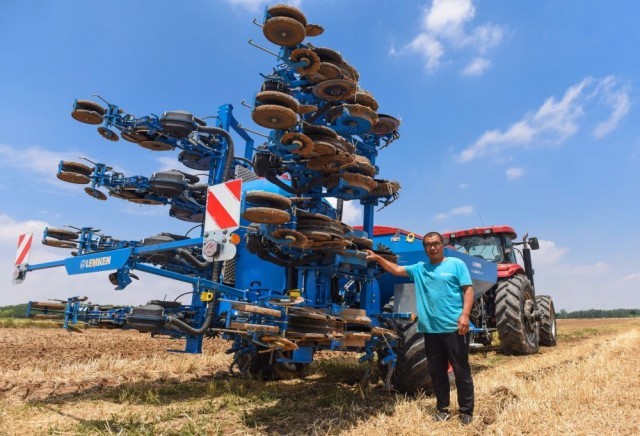 ↑6月15日,农机手侯建林站在山东省胶州市铺集镇五谷丰登农场的农田里与大型玉米播种机合影。新华社发(王昭脉摄)