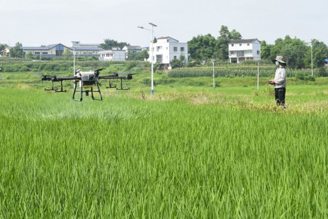 ↑6月17日,在四川省广安市广安区大安镇,桂定友操作植保无人机为水稻喷施叶面肥。桂定友来自当地一家科技公司,这次和同事带着4台植保无人机开展植保服务。从2015年以来,该公司专为周边区县的农作物提供专业植保服务。新华社发(张国盛摄)
