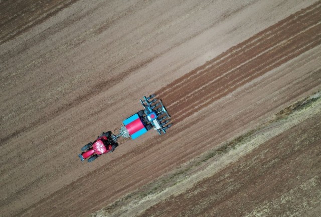 ↑6月15日,在山东省胶州市铺集镇五谷丰登农场,农机手侯建林驾驶大型玉米播种机在农田播种(无人机照片)。新华社发(王昭脉摄)