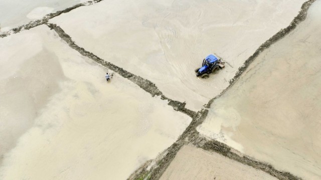 ↑6月16日,娄方书开着轮式拖拉机在贵州省桐梓县狮溪镇整理一片未插秧的稻田(无人机照片)。娄方书购买轮式拖拉机6台,组织当地村民利用机械种植水稻。新华社发(王印摄)