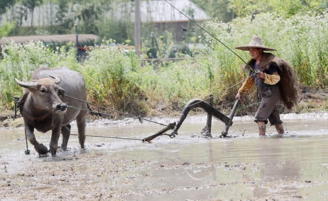 ↑6月17日,在浙江省湖州市德清县莫干山镇筏头村,农户沈水根和耕牛“二牛子”在耕田犁地。沈水根自16岁开始养牛耕田,“二牛子”已陪伴主人耕作3年多。新华社发(谢尚国摄)