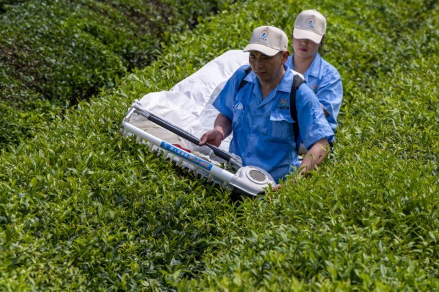 ↑6月15日,浙江省金华市的一个茶园里,郑胜平(左)和同事使用单人抬式采茶机采茶。新华社发(胡肖飞摄)