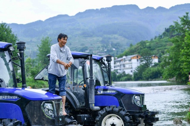 ↑6月16日,在贵州省桐梓县狮溪镇,娄方书在清洗轮式拖拉机。娄方书购买轮式拖拉机6台,组织当地村民利用机械种植水稻。新华社发(王印摄)