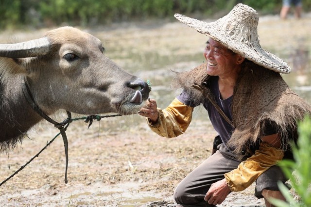 ↑6月17日,在浙江省湖州市德清县莫干山镇筏头村,农户沈水根注视着他的耕牛“二牛子”。沈水根自16岁开始养牛耕田,“二牛子”已陪伴主人耕作3年多。新华社发(谢尚国摄)