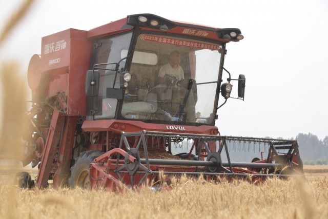 ↑6月16日,在河北省保定市望都县南无村,来自湖北的“麦客”周全慧驾驶联合收割机在收割小麦。新华社发(陈卫红摄)