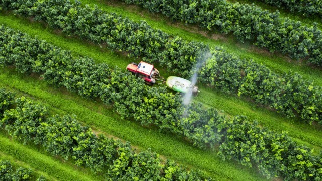 ↑6月17日,在广西靖西市化峒镇五权村沃柑种植基地,农机手李康驾驶连着喷药机的拖拉机喷洒农药(无人机照片)。新华社发(赵京武摄)