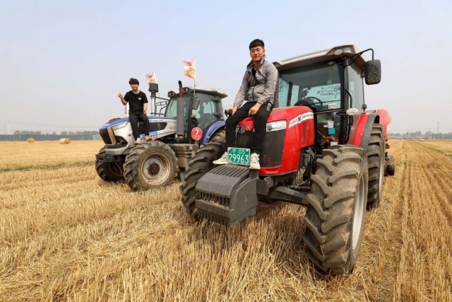 ↑6月16日,在河北省石家庄市行唐县独羊岗乡的麦田里,来自宁夏的农机手马都(左)和马智彬与自己的“伙计”合影。马都(左)驾驶的是秸秆搂草机,马智彬驾驶的是秸秆打包机。新华社发(梁子栋摄)
