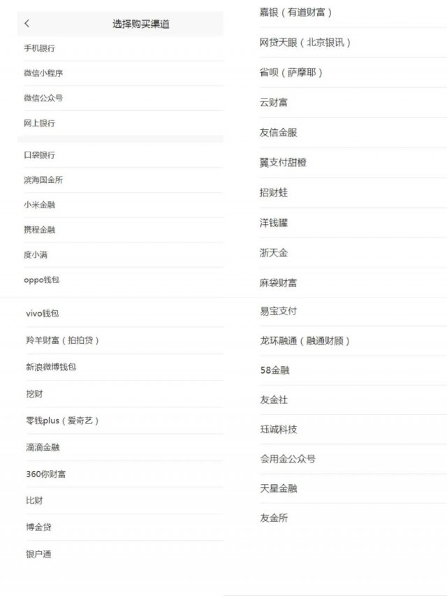 在交易渠道方面,数家村镇银行登记表中给出的选项除4家自营渠道外,还包括口袋银行、滨海国金所、小米金融、携程金融、度小满、oppo钱包、vivo钱包等30多家第三方渠道。