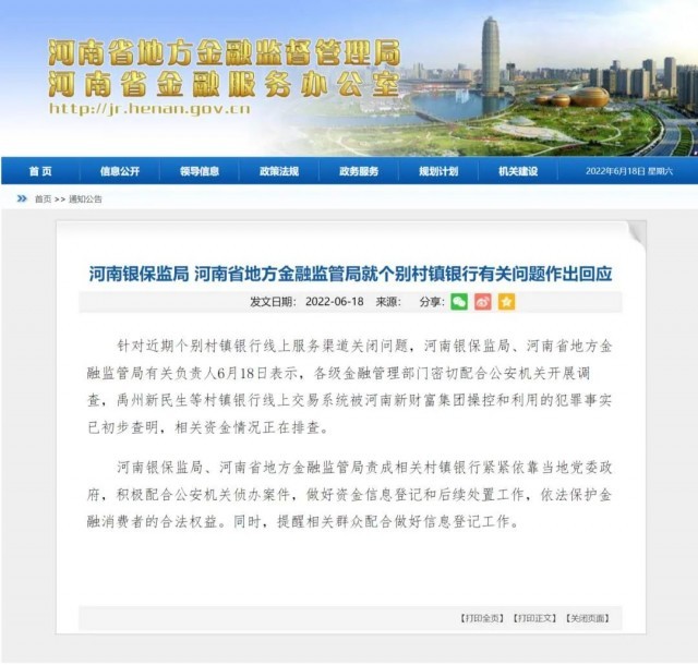 随后,河南银保监局、河南省地方金融监管局有关负责人6月18日表示,针对近期个别村镇银行线上服务渠道关闭问题,各级金融管理部门密切配合公安机关开展调查,禹州新民生等村镇银行线上交易系统被河南新财富集团操控和利用的犯罪事实已初步查明,相关资金情况正在排查。