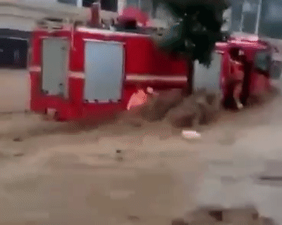 消防车在激流中被冲退
